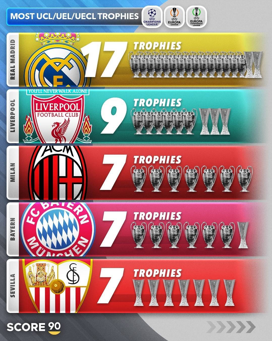 欧战冠军数排行:皇马17冠遥遥领先,利物浦9冠,米兰拜仁塞维7冠